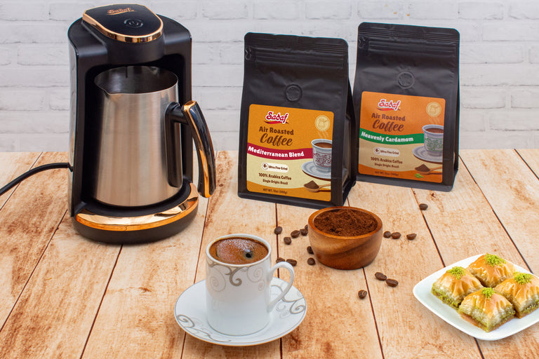 Experience the perfect pairing: Sadaf’s Air Roasted Coffee and our signature Mediterranean Coffee Maker. Crafted for authentic flavor and effortless brewing, this duo brings the richness of Mediterranean coffee culture into your daily ritual. Enjoy smooth, aromatic blends like Heavenly Cardamom and Mediterranean Blend, freshly brewed in minutes.